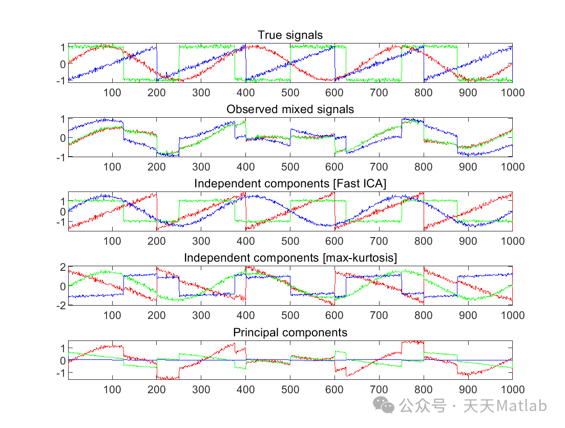 FastICA是一种迭代算法,它通过寻找使得负熵最大化的方向来分离独立成分。FastICA算法速度快,且不需要事先估计信号的概率密度函数。