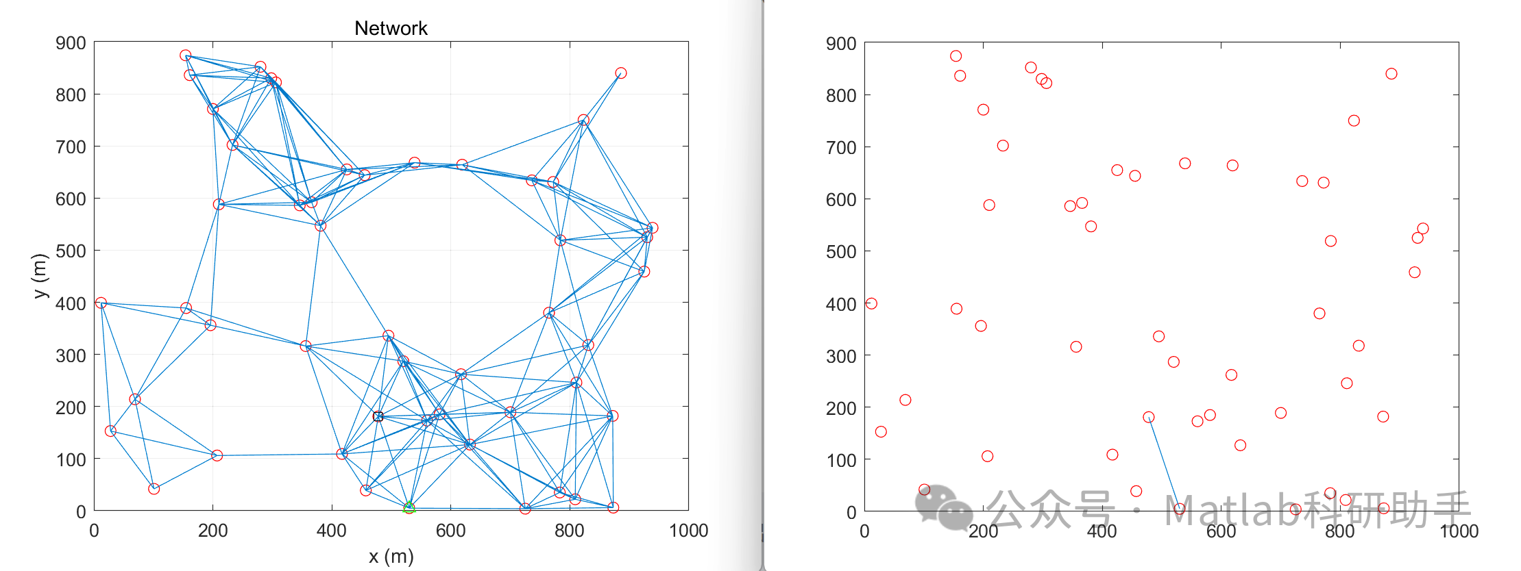 设置一定数量的节点,例如 50 个或 100 个节点,分布在一定大小的区域内(例如 500m x 500m 或 1000m x 1000m)。