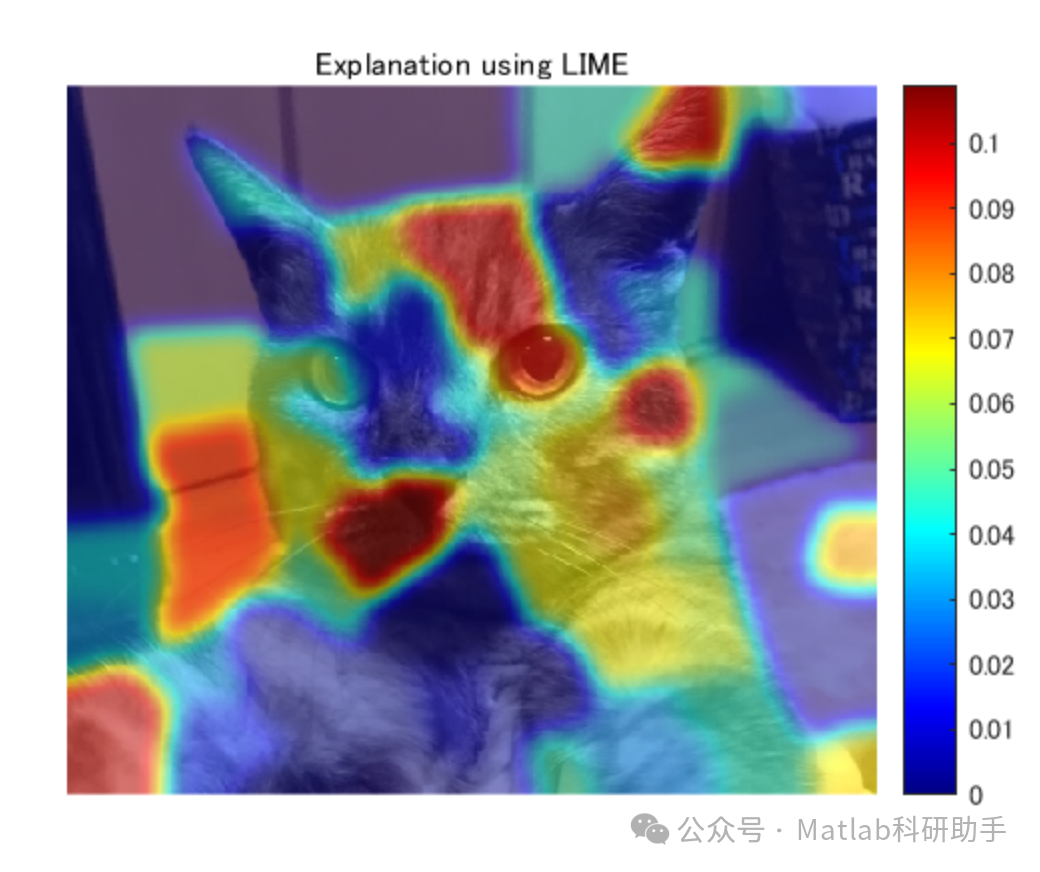 可视化并分析解释结果: 将LIME生成的解释以热力图的形式叠加在原始图像上。分析解释区域是否与人类对图像内容的关键部分的认知相符。例如,在识别猫的图像中,LIME是否高亮显示了猫的头部、眼睛、耳朵等区域。