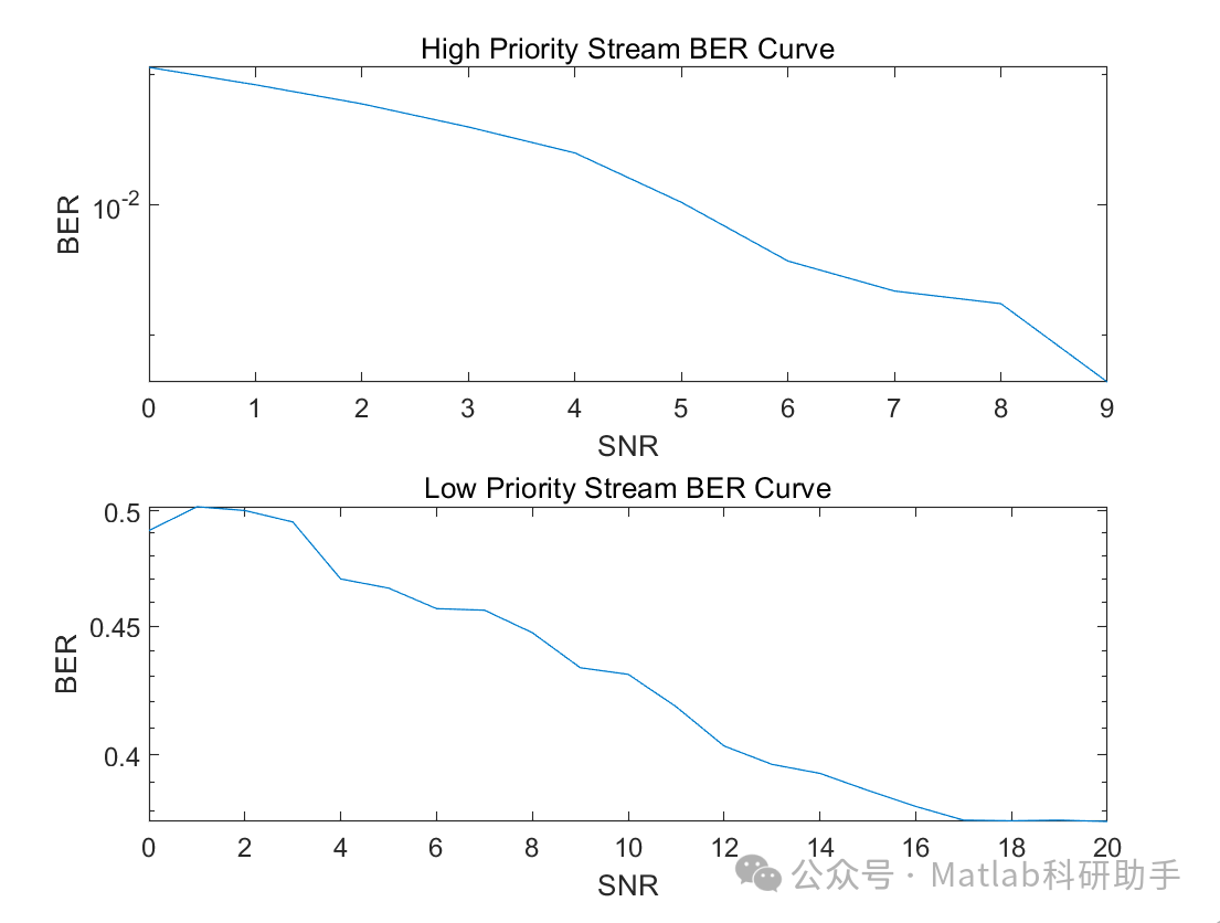 为了评估实现的416-QAM分层调制方案的性能,我们需要在不同信噪比下进行仿真,并计算总体误码率以及HP和LP层的误码率。由于分层调制的特性,HP层的误码率应该显著低于LP层的误码率,尤其是在中低信噪比条件下。