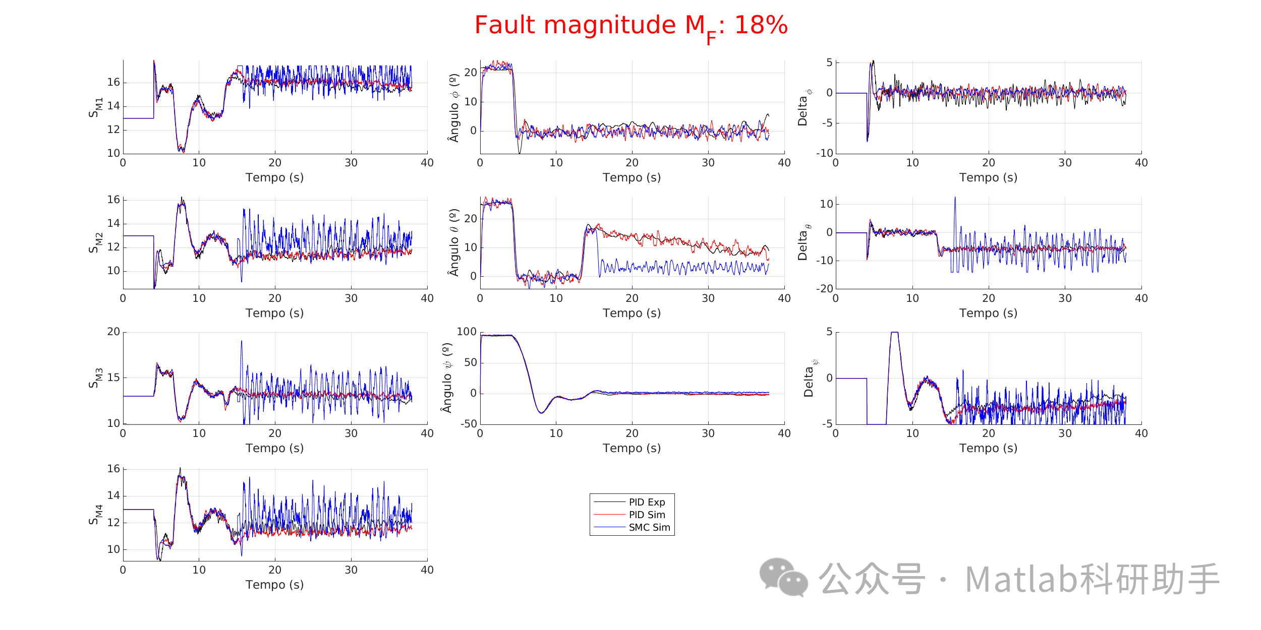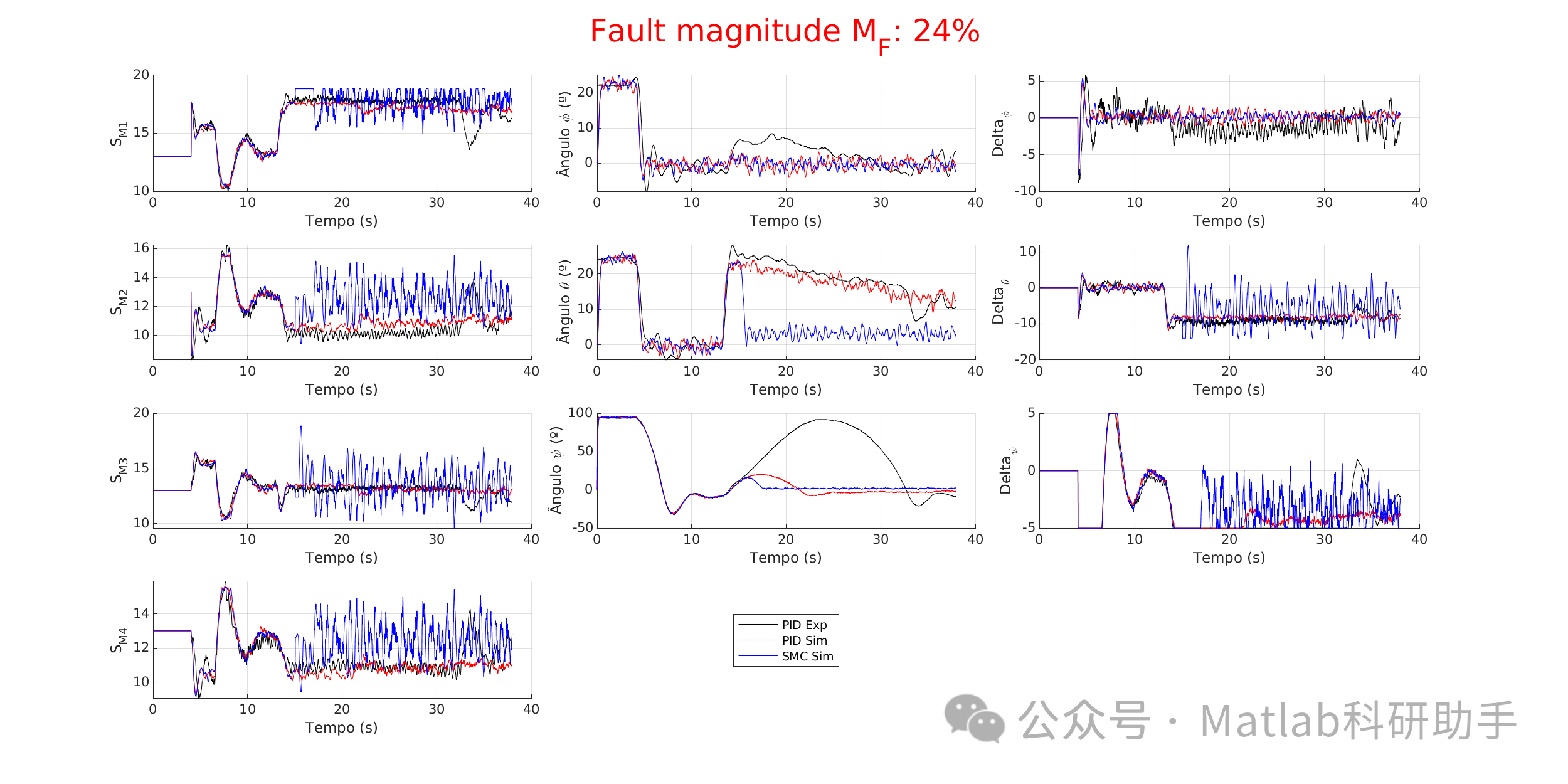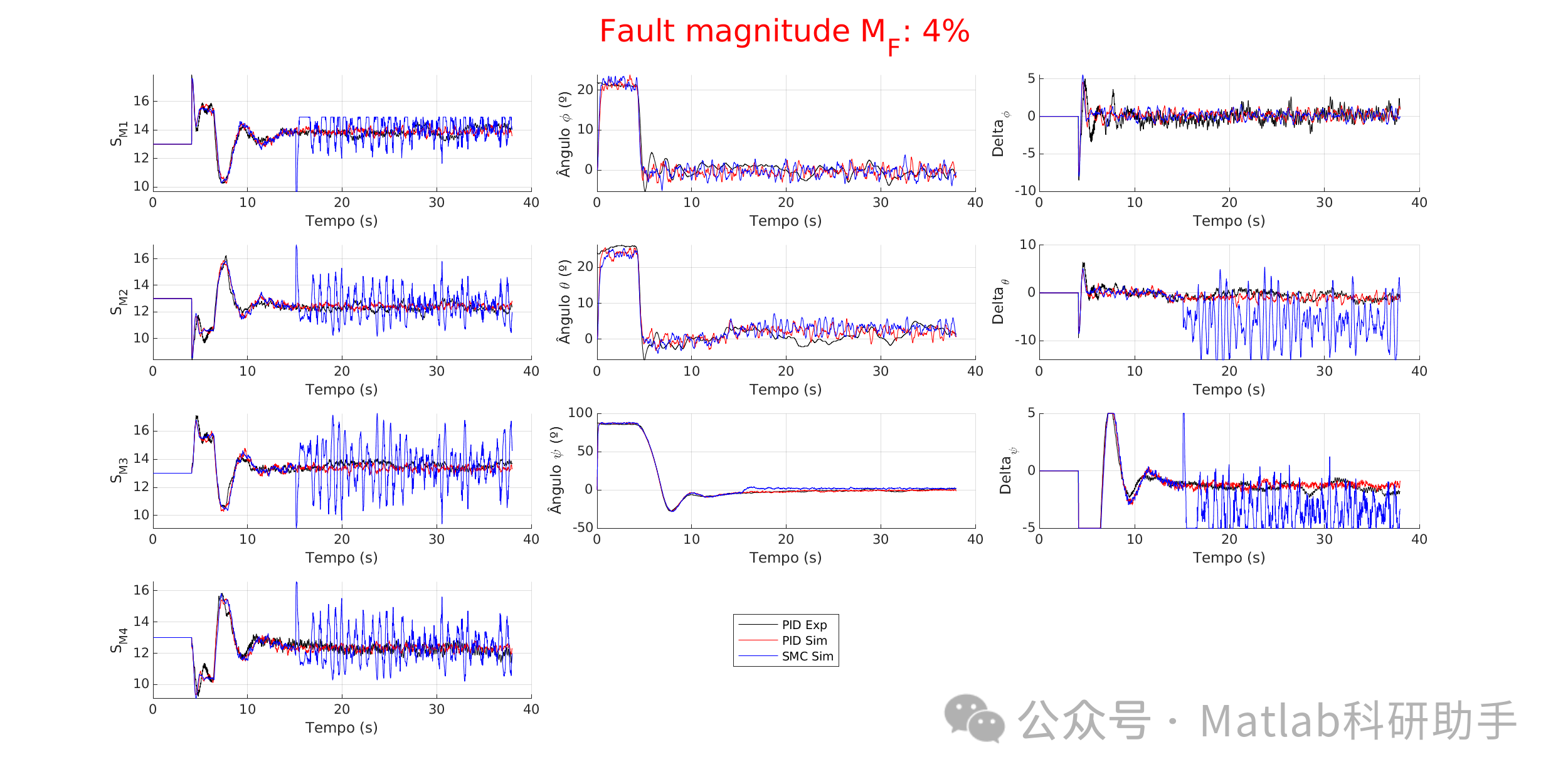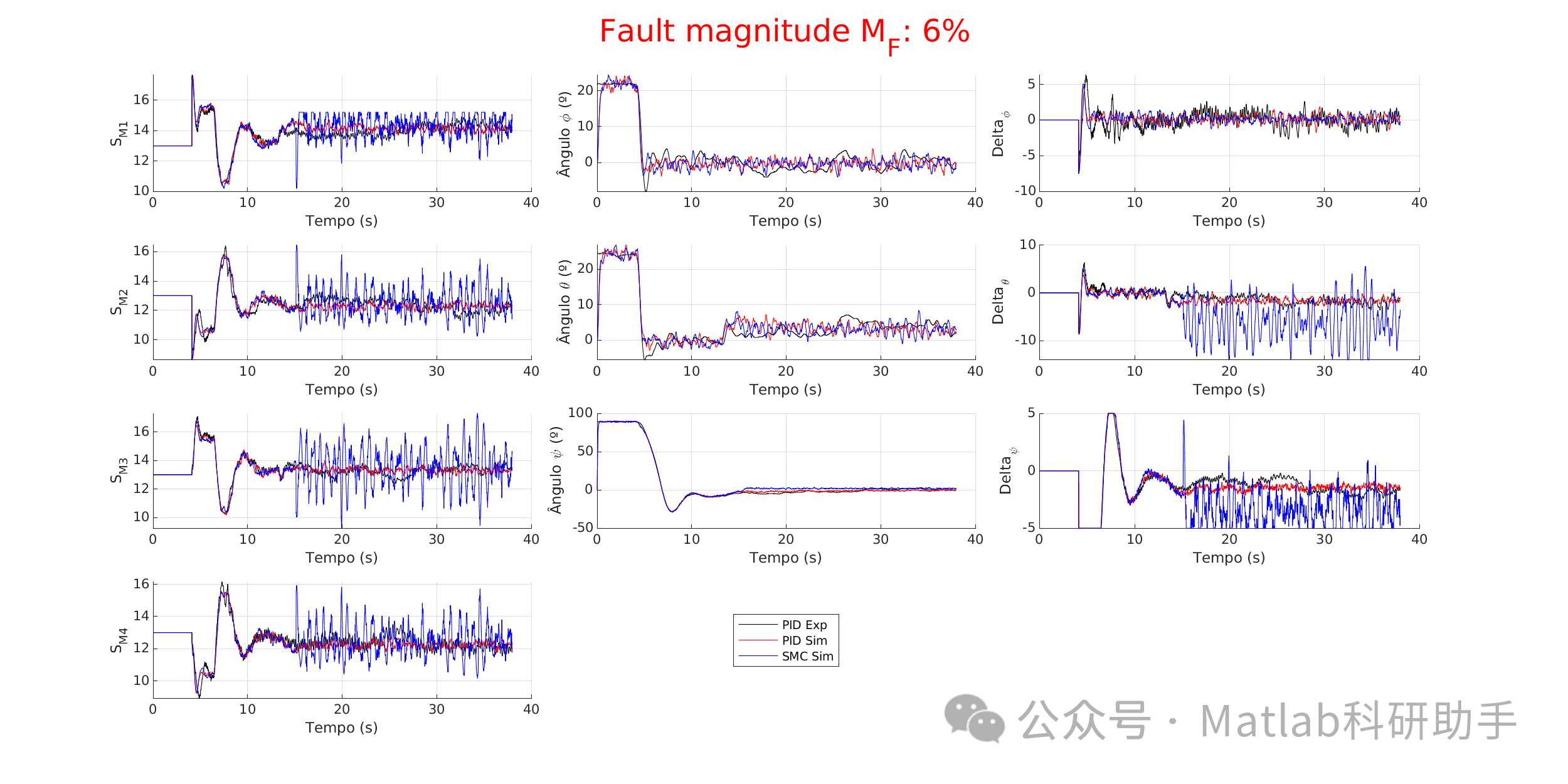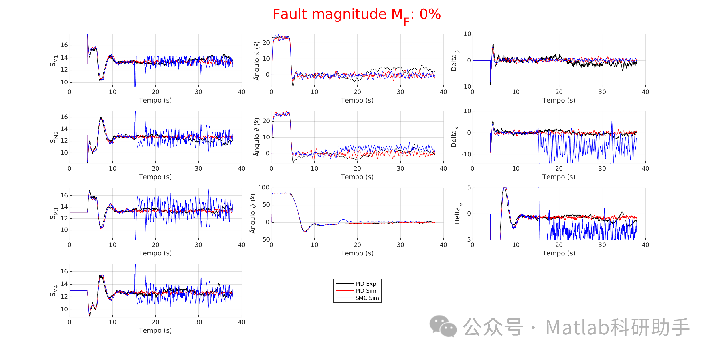 :重点关注飞行器的姿态误差、位置误差、角速度、控制输入(电机推力)以及滑模面的收敛情况。将滑模控制的性能与传统的PID控制进行对比,评估其在故障情况下的鲁棒性和稳定性。