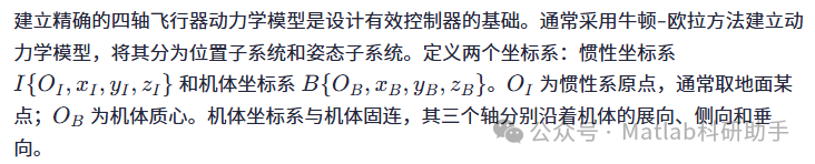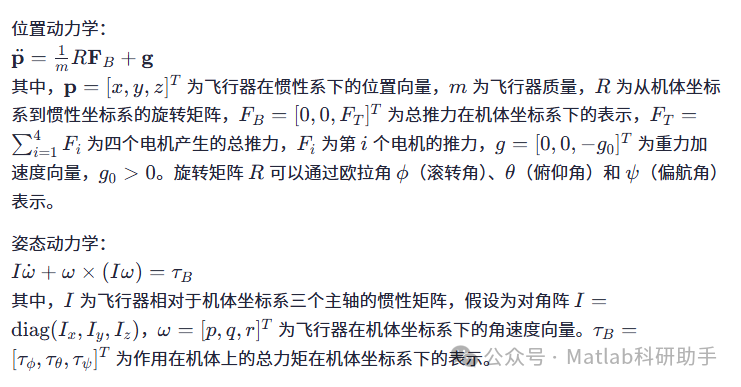 假设四轴飞行器是一个刚体,且质心与几何中心重合。忽略空气动力学效应、电机动态和柔性结构的影响,四轴飞行器的位置和姿态动力学方程可以表示为: