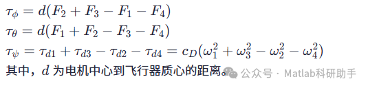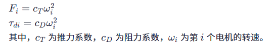 四个电机的推力和力矩通常与电机的转速平方成正比: