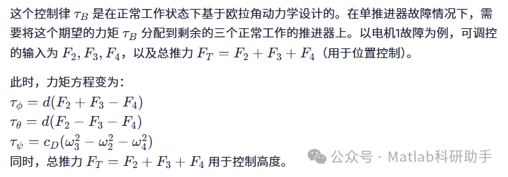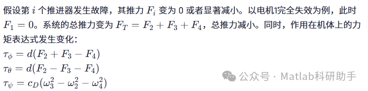 可以看出,电机1的失效不仅导致总推力减小,更重要的是改变了三个轴向的耦合力矩关系。特别是滚转轴和俯仰轴的力矩表达式不再对称,无法通过简单的调整其他电机的输出线性补偿。这种非对称的力矩分布是导致姿态失稳的关键因素。此外,由于总推力减小,飞行器将难以维持原有的高度,需要增加剩余电机的输出,进一步加剧了系统的非线性。