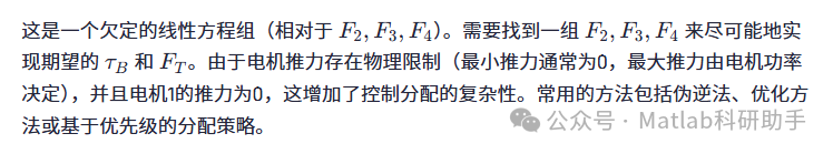 实际应用中,为了简化问题,常常忽略偏航角力矩的精确控制(因为偏航角力矩对推力的贡献相对较小),而优先满足滚转角和俯仰角的控制。或者采用基于优先级的分配策略,例如优先满足姿态力矩,再满足总推力。