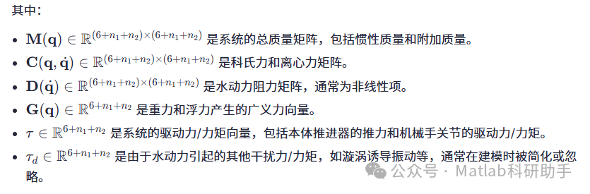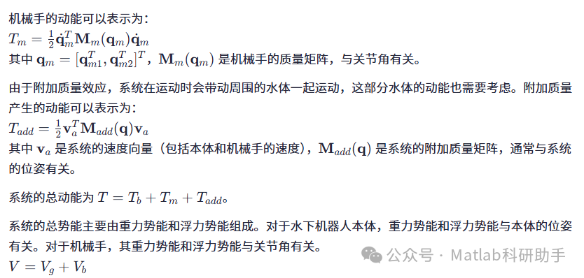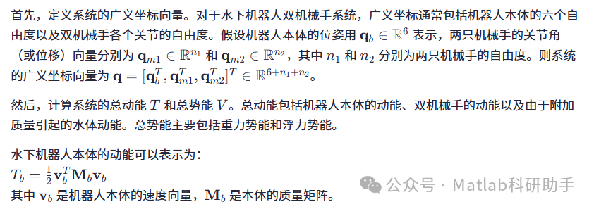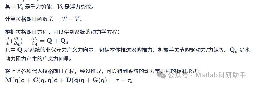 精确的动力学模型是设计有效控制器的前提。对于水下机器人双机械手系统,常用的动力学建模方法包括牛顿-欧拉法和拉格朗日法。考虑到系统的复杂性,拉格朗日法通常更适用于推导其动力学方程。