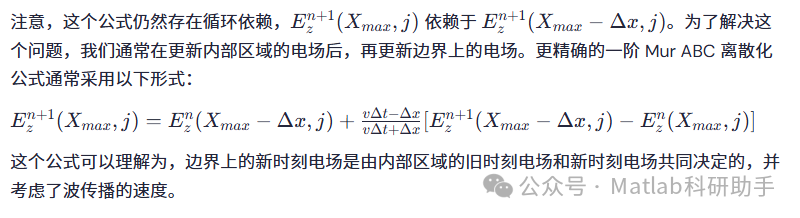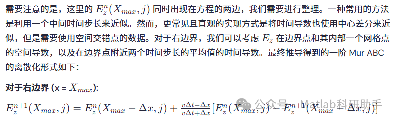 在实现时,通常的步骤是在每个时间步长内,先根据内部区域的 FDTD 迭代公式更新所有内部网格点的电场和磁场分量。然后,根据上述 Mur ABC 公式更新边界上的电场分量。由于磁场分量定义在网格边上,其边界处理也需要类似的方法,但这里主要以电场为例进行说明。