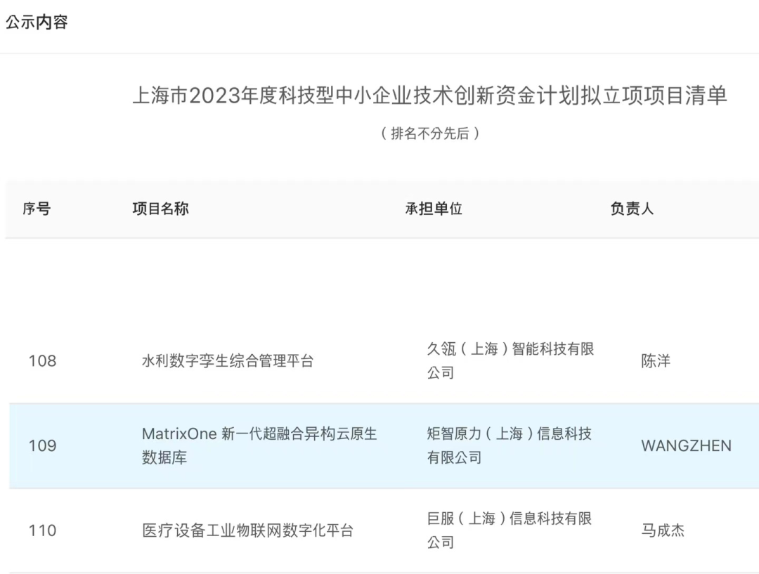近日,MatrixOne 新一代超融合异构云原生数据库成功获得上海市科技型中小企业技术创新资金计划项目立项资助。
