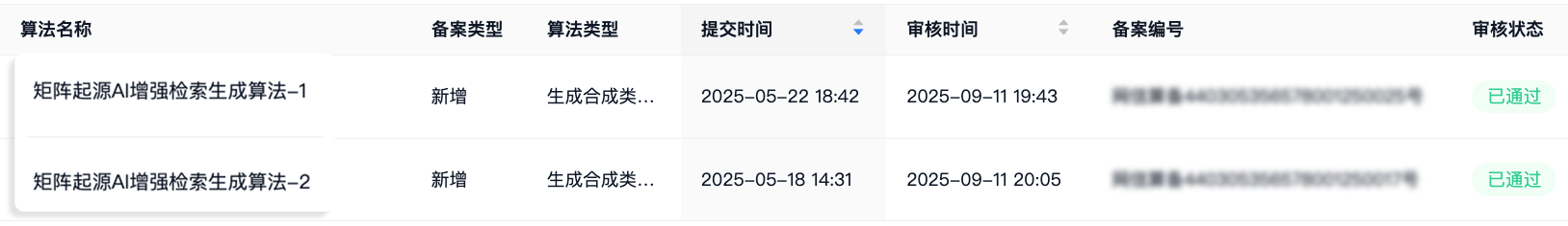 2025 年 9 月 11 日,国家互联网信息办公室公告第十三批深度合成服务算法备案信息,由矩阵起源自主研发的“矩阵起源AI搜索生成算法-1”、“矩阵起源AI搜索生成算法-2”两件算法成功通过备案。这既是对矩阵起源技术研发合规性的官方认证,更体现了公司“多模态数据融合治理”发展思路的落地成效,标志矩阵起源跻身为国内为数不多在数据智能(Data+AI)领域中真正落地的技术服务商