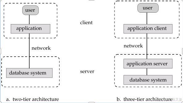 - 三层架构:客户端、应用服务器和数据库系统(给予Web的程序、使用中间件构建的应用程序)