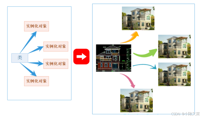 打一个比方,类实例化对象,就像使用设计图建造房子一样。类就是设计图,只是设计建筑需要什么东西,但是并没有实体建筑。类也只是一个设计,在实例化之前并没有实际的储存数据,占用物理空间。