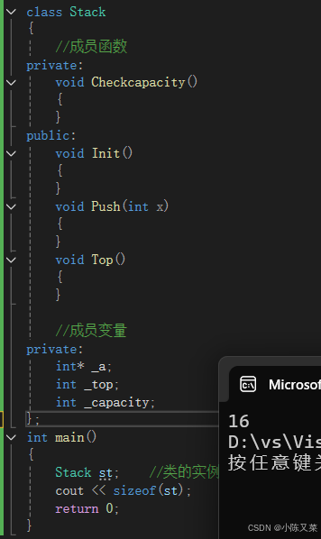 class Stack { //成员函数 private: void Checkcapacity() { } public: void Init() { } void Push(int x) { } void Top() { } //成员变量 private: int* _a; int _top; int _capacity; }; int main() { Stack st; //类的实例化,st就是一个对象 st.Init(); st.Push(1); st.Top(); return 0; }