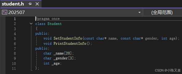 class Student { public: void SetStudentInfo(const char* name, const char* gender, int age) { strcpy(_name, name); strcpy(_gender, gender); _age = age; } void PrintStudentInfo() { cout << _name << " " << _gender << " " << _age << endl; } public: char _name[20]; char _gender[3]; int _age; };注意: