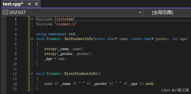 //student.h //学生 class Student { public: void SetStudentInfo(const char* name, const char* gender, int age); void PrintStudentInfo(); public: char _name[20]; char _gender[3]; int _age; }; //test.cpp #include "student.h" void Student::SetStudentInfo(const char* name, const char* gender, int age) { strcpy(_name, name); strcpy(_gender, gender); _age = age; } void Student::PrintStudentInfo() { cout << _name << " " << _gender << " " << _age << endl; }