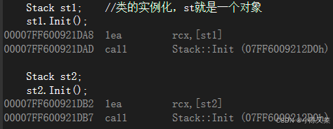 int main() { Stack st1; //类的实例化,st就是一个对象 st1.Init(); Stack st2; st2.Init(); return 0; }我们这里实例化两个对象,并且分别了调用两个对象的初始化函数,然后通过汇编代码看一下两个函数调用的地址: