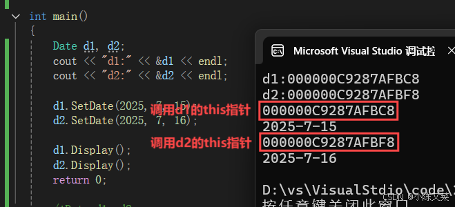 class Date { public: void Display() { //使用this指针 cout << this << endl; cout << _year << "-" << _month << "-" << _day << endl; } void SetDate(int year, int month, int day) { _year = year; _month = month; _day = day; } private: int _year; // 年 int _month; // 月 int _day; // 日 }; int main() { Date d1, d2; cout <<"d1:"<< & d1 << endl; cout <<"d2:"<< & d2 << endl; d1.SetDate(2025, 7, 15); d2.SetDate(2025, 7, 16); d1.Display(); d2.Display(); return 0; }运行结果: