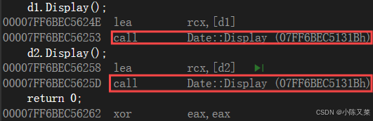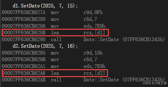 我们看到两次调用的函数的地址是一样的,那么大家思考一下,既然调用的函数是一样的,那么编译器为什么知道d1是2025-7-15。而d2是2025-7-16呢?