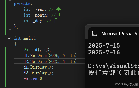class Date { public: void Display() { cout << _year << "-" << _month << "-" << _day << endl; } void SetDate(int year, int month, int day) { _year = year; _month = month; _day = day; } private: int _year; // 年 int _month; // 月 int _day; // 日 }; int main() { Date d1, d2; d1.SetDate(2025, 7, 15); d2.SetDate(2025, 7, 16); d1.Display(); d2.Display(); return 0; }运行结果: