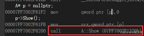 因为之前在讲解类和对象的时候我们讲过,成员函数是储存在公共代码区,调用的时候只需要call函数的地址就行。而虽然我们这里this被赋值了nullptr,也就是this被初始化为空指针而已,只是被允许的,我们看一下运行结果和反汇编结果: