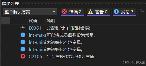 void SetDate(int year, int month, int day) { this = nullptr; //将nullptr赋值给this _year = year; _month = month; _day = day; }很显然是错误的,因为前面提到了this是被const修饰的,是不允许被修改的。如果编译的话会爆出这样一个错误: