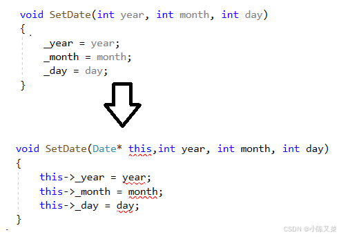 这样理解是不是就会好一些,也就是在调用成员函数时候都会往里面传入了一个指针,指向的是当前对象。但是再次提醒,我们不能显式地写出来,不能抢了编译器的活。