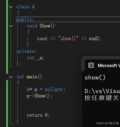 class A { public: void Show() { cout << "show()" << endl; } private: int _a; }; int main() { A* p = nullptr; p->Show(); return 0; }答案:C