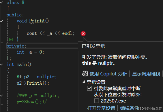 大家可能有疑问,这不是跟上面一个类型的题目吗,为什么上面那个能够正常运行,这个就会运行崩溃呢?大家注意这两道题的区别,第二道题中存在对成员变量的访问(即this->_a),而成员变量的访问是需要获取对象的地址的(也就是this指针),但是这里的this指针被初始化成了空指针(因为p2被赋值了nullptr),所以这里就变成了对空指针的解引用,自然会报错: