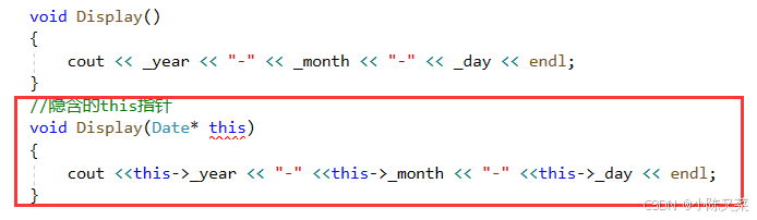 并且我们刚才讨论过了,这个this指针是真实存在的,所以我们是可以直接使用的,当然我并不需要显示地传入参数,直接直接调用即可: