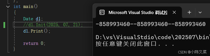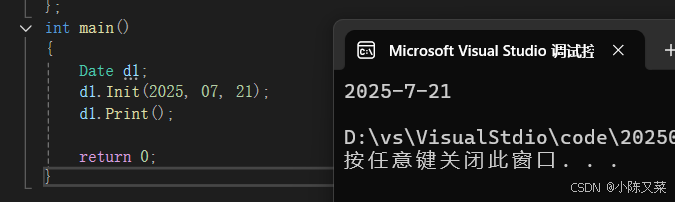 class Date { public: void Print() { cout << _year << "-" << _month << "-" << _day << endl; } void Init(int year, int month, int day) { _year = year; _month = month; _day = day; } private: int _year; int _month; int _day; }; int main() { Date d1; d1.Init(2025, 07, 21); d1.Print(); return 0; }运行结果: