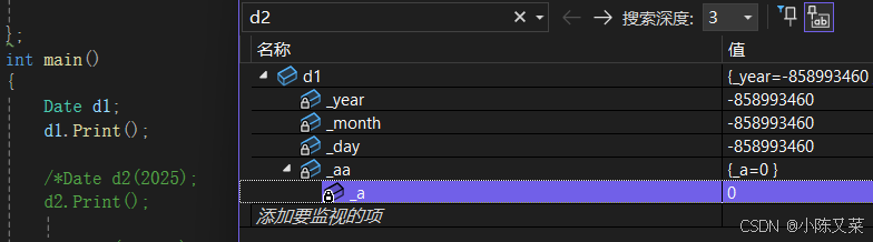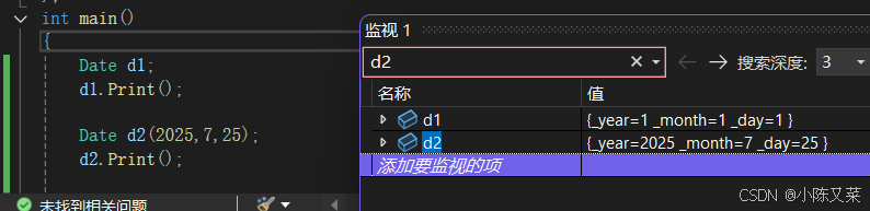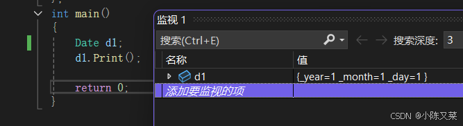 class Date { public: void Print() { cout << _year << "-" << _month << "-" << _day << endl; } //构造函数,自动调用 Date() { _year = 1; _month = 1; _day = 1; } private: int _year; int _month; int _day; }; int main() { Date d1; d1.Print(); return 0; }调试过程中就能够发现,自动调用了构造函数: