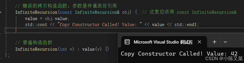 class InfiniteRecursion { public: int value; // 错误的拷贝构造函数:参数是传值而非引用 InfiniteRecursion(InfiniteRecursion obj) { // 这里应该用 const InfiniteRecursion& value = obj.value; std::cout << "Copy Constructor Called! Value: " << value << std::endl; } // 普通构造函数 InfiniteRecursion(int v) : value(v) {} }; int main() { InfiniteRecursion obj1(42); InfiniteRecursion obj2 = obj1; // 这里会触发无限递归! return 0; }根据我们之前写的拷贝构造函数的概念,拷贝构造函数在使用已存在的类类型对象 创建信对象时编译器自动调用: