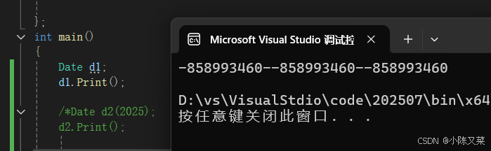 class Date { public: void Print() { cout << _year << "-" << _month << "-" << _day << endl; } private: int _year; int _month; int _day; }; int main() { Date d1; d1.Print(); return 0; }就像这里,我们并没有定义构造函数,但其实C++编译器会自动生成一个构造函数: