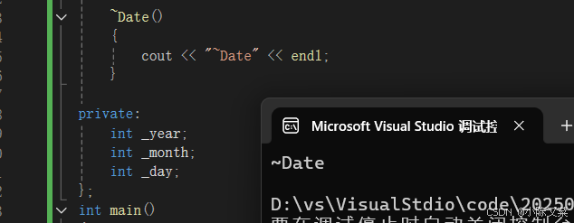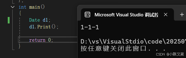 class Date { public: void Print() { cout << _year << "-" << _month << "-" << _day << endl; } ~Date() { cout << "~Date" << endl; } private: int _year; int _month; int _day; }; int main() { Date d1; return 0; }运行结果: