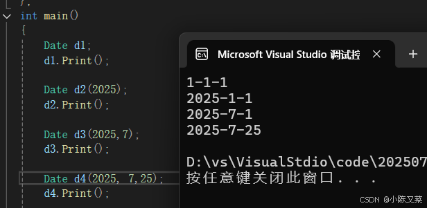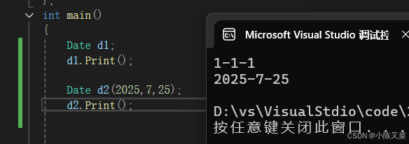 class Date { public: void Print() { cout << _year << "-" << _month << "-" << _day << endl; } //自动调用 // 1.无参构造函数 Date() { _year = 1; _month = 1; _day = 1; } // 2.带参构造函数 Date(int year, int month, int day) { _year = year; _month = month; _day = day; } private: int _year; int _month; int _day; }; int main() { Date d1; d1.Print(); Date d2(2025,7,25); d2.Print(); return 0; }我们来看一下运行结果: