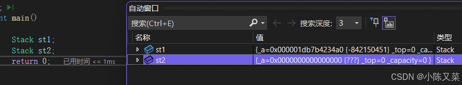 通过添加监视,然后逐语句分析,我们发现编译器先初始化了st1。然后在两行语句都执行完了之后,程序要结束时,进入了析构函数,并且先析构了st2: