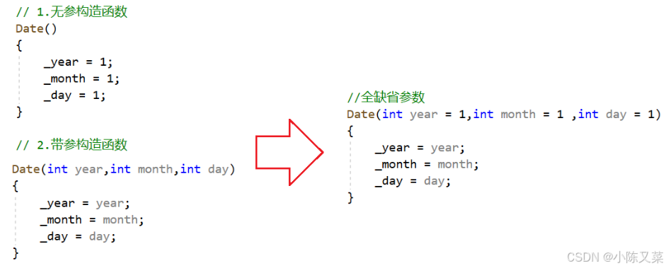 //全缺省参数 Date(int year = 1,int month = 1 ,int day = 1) { _year = year; _month = month; _day = day; }