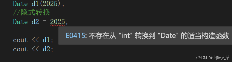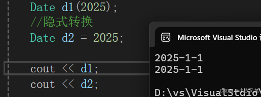 我定义的d2很明显是一个Date日期类,但是2025很明显是一个int类型,但是我却成功运行了这段程序,并且发现2025被初始化成了_year。这是怎么回事?