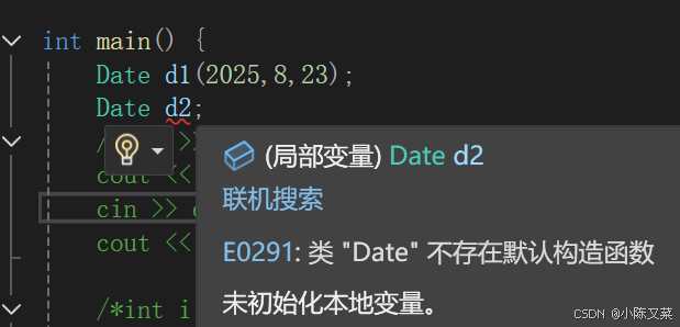 class Date { public: Date(int year, int month, int day) { _year = year; _month = month; _day = day; } private: int _year; int _month; int _day; }; int main() { Date d1(2025,8,23); //对于下面这个无参的对象,无法调用构造函数 //因为我们只有含参的构造函数 Date d2; }
