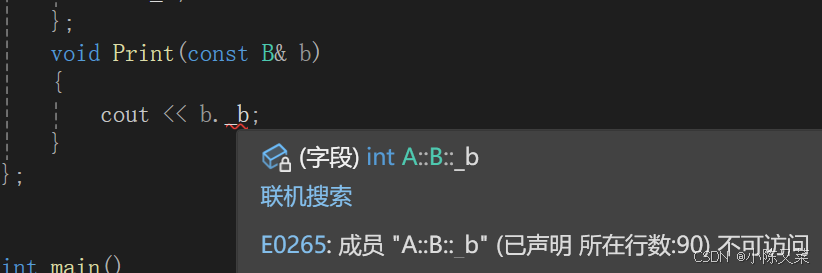 class A { private: static int k; int h; public: //内部类 class B//B天生是A的有友元 { public: void foo(const A& a) { cout << k << endl; cout << a.h << endl; } private: int _b; }; };然后我们来探讨一下这个内部类能干嘛?