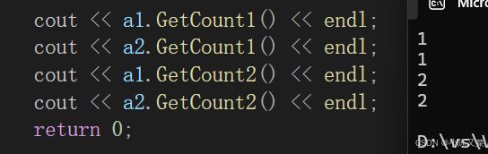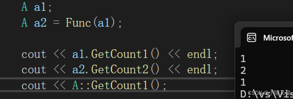 class A { public: A() { ++_count1; } A(const A& aa) { ++_count2; } //访问接口 int GetCount1() { return _count1; } int GetCount2() { return _count2; } private: //静态成员变量属于整个类 static int _count1;//声明 static int _count2; int _a; }; A Func(A a) { A copy(a); return copy; } //定义 int A::_count1 = 0; int A::_count2 = 0; int main() { A a1; A a2 = Func(a1); cout << a1.GetCount1() << endl; cout << a2.GetCount1() << endl; cout << a1.GetCount2() << endl; cout << a2.GetCount2() << endl; return 0; }
