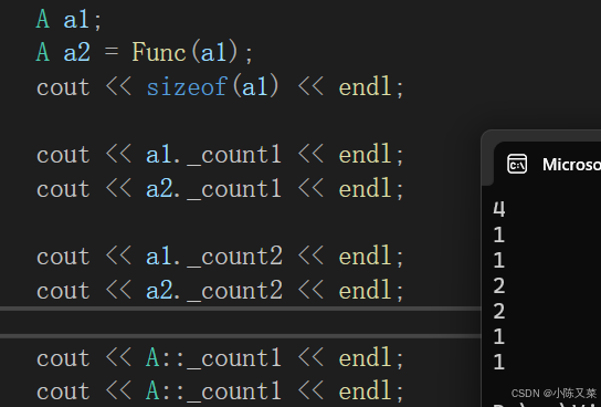 #include <iostream> using namespace std; class A { public: A() { ++_count1; } A(const A& aa) { ++_count2; } //静态成员变量属于整个类 static int _count1;//声明 static int _count2; int _a; }; A Func(A a) { A copy(a); return copy; } //定义 int A::_count1 = 0; int A::_count2 = 0; int main() { A a1; A a2 = Func(a1); cout << sizeof(a1) << endl; cout << a1._count1 << endl; cout << a2._count1 << endl; cout << a1._count2 << endl; cout << a2._count2 << endl; cout << A::_count1 << endl; cout << A::_count1 << endl; return 0; }