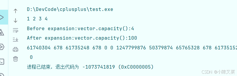 #include <iostream> #include <vector> using namespace std; int main() { vector<int> v{ 1,2,3,4 }; for (size_t i = 0; i < v.size(); ++i) cout << v[i] << " "; cout << endl; auto it = v.begin(); cout << "Before expansion:vector.capacity():" << v.capacity() << endl; v.reserve(100); cout << "After expansion:vector.capacity():" << v.capacity() << endl; while (it != v.end()) { cout << *it << " "; ++it; } cout << endl; return 0; }在VS下会直接崩溃: