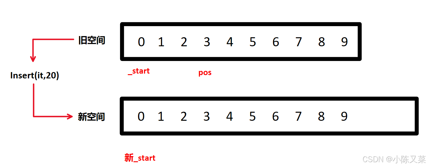 我们采用的解决方式是计算相对位置,也就是说我们先记下_start和pos之间的距离n,然后在新空间的_start上加上n就能得到新空间的pos位置,it就会有了新空间的指向。