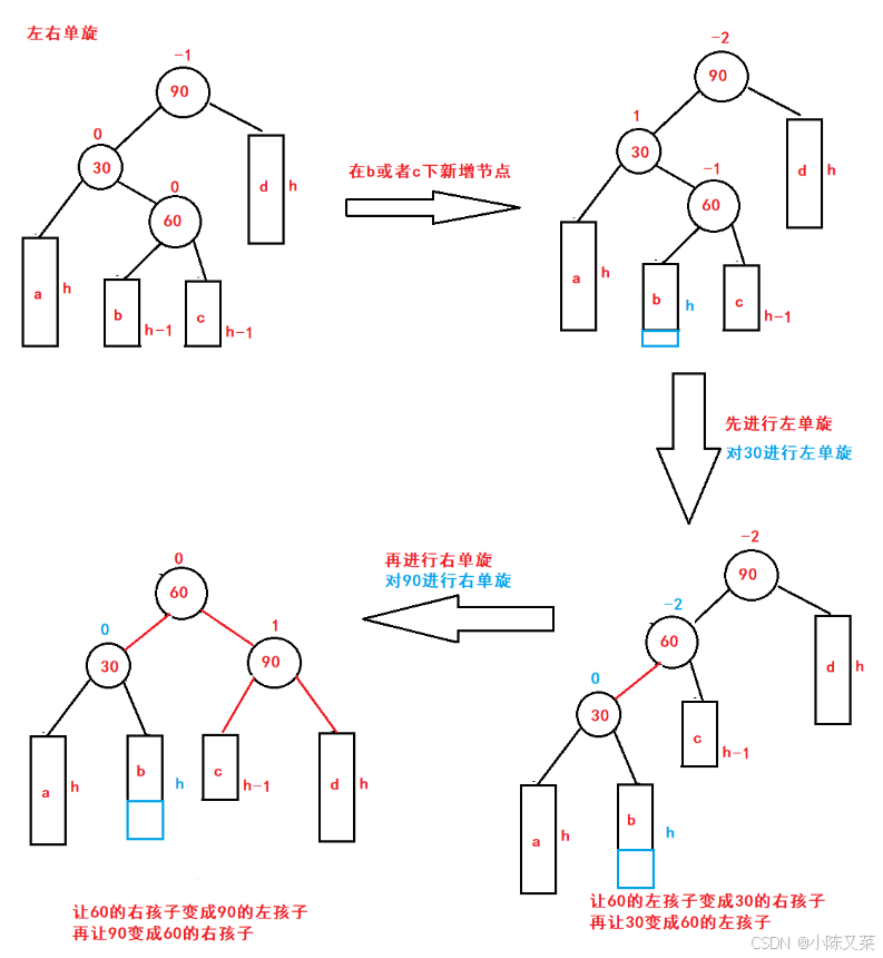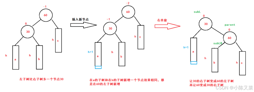 - 让插入节点的父节点,也就是这里的60的左子树变成节点30的右子树,30这颗子树成为60的左子树。