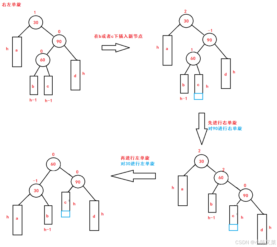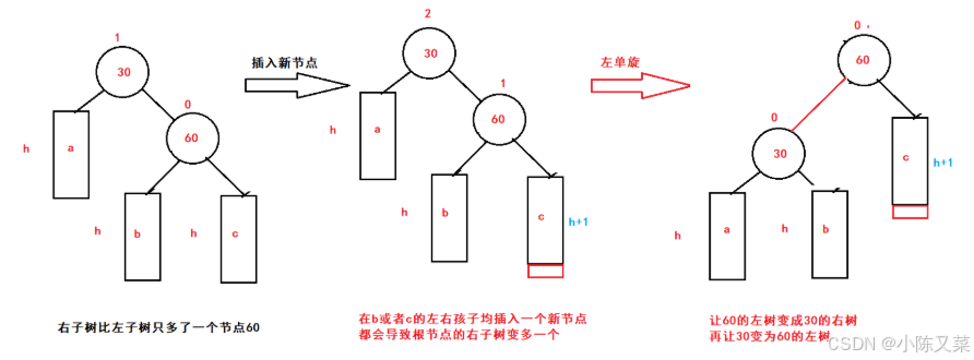 然后我们来看更复杂的情况,在下图中,无论在b还是c树下插入新节点,都是在30的右树下插入新节点,因此这里将有4中可能性(分别是b的左右孩子,c的左右孩子处),这里以c的孩子为例。但是情况均为左单旋情况。