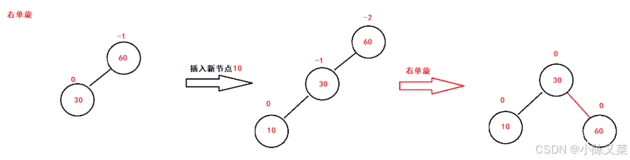 我们先举一个最简单的例子,在下图中,我们需要插入节点10,这导致60(根节点)的平衡因子不满足AVL树规则,那我们要想重新平衡,就需要将60的左子树较少一层即可,右子树增加一层,即将左子树提上来即可。