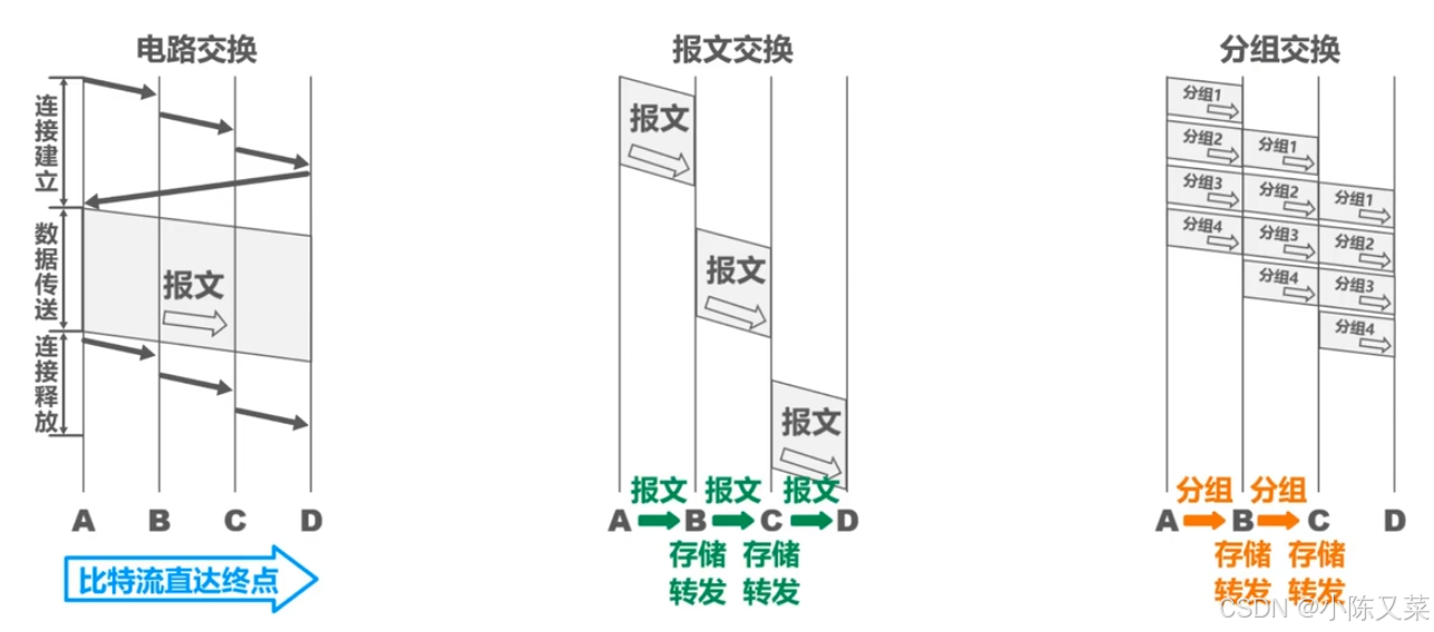 - 电路交换:需要建立连接以及最后的释放连接。但是每一个结点之间是直通形式的,比特流可以直达终点