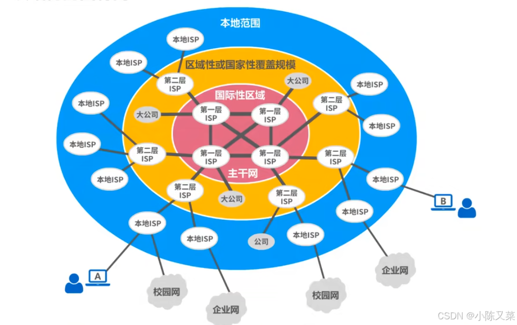 - 这里需要注意的是,这张图只是一个示意图,因为随着互联网的发展,因特网的结构已经越来越复杂,很难简单地进行描述