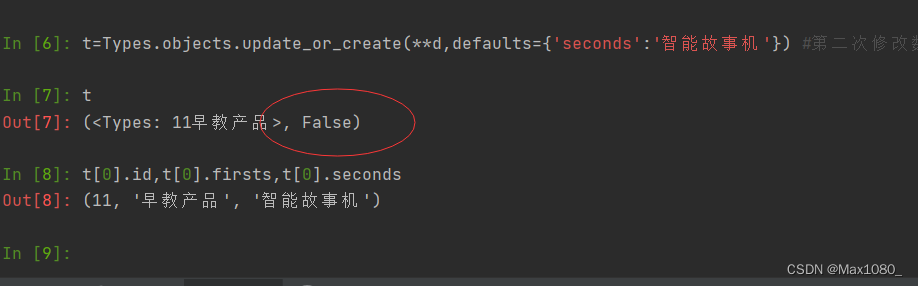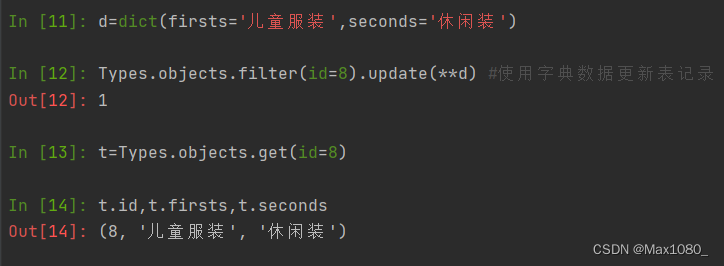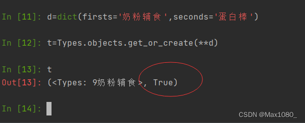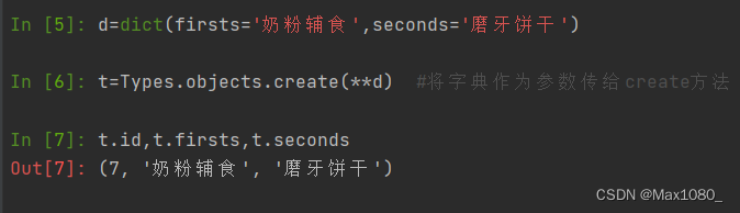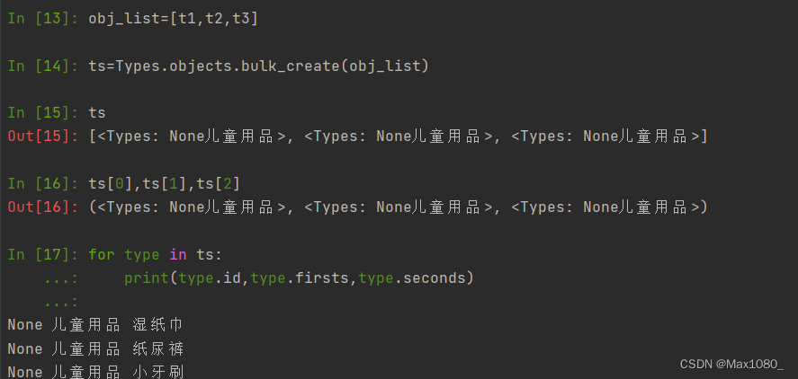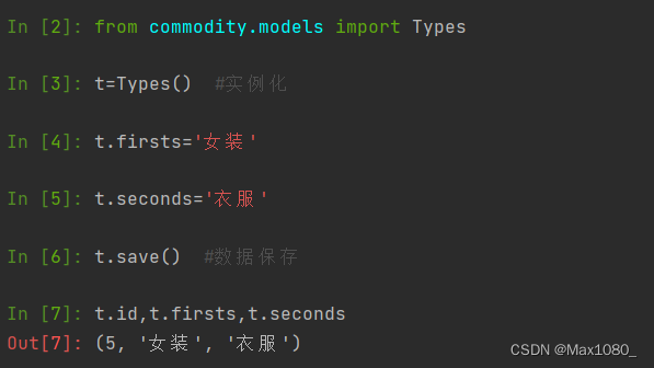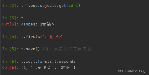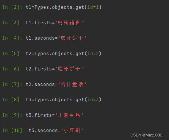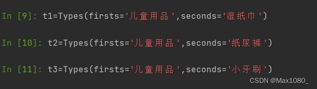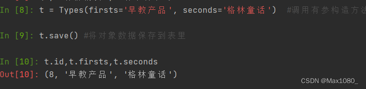 - 调用有参构造方法实例化:t=Types(firsts='早教产品',seconds='格林童话')