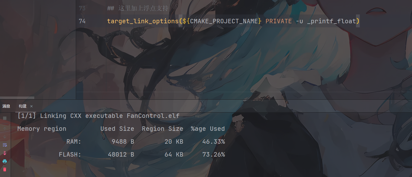 通过在 CMake 中添加 target_link_options(${CMAKE_PROJECT_NAME} PRIVATE -u _printf_float),可以强制启用浮点打印功能,但需注意 Flash 占用增加。